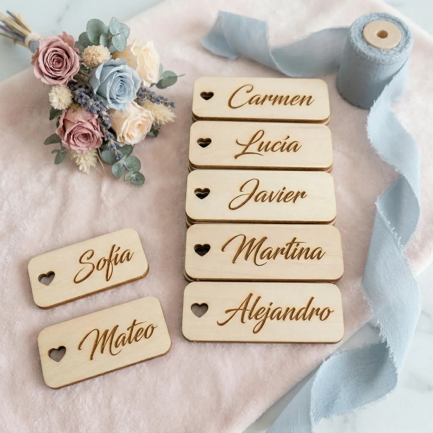 Marcasitios tradicionales de madera con diseño atemporal, grabados con los nombres de tus invitados. Una pieza clásica que añade elegancia a tu mesa y sirve como recuerdo preciado de tu día especial.