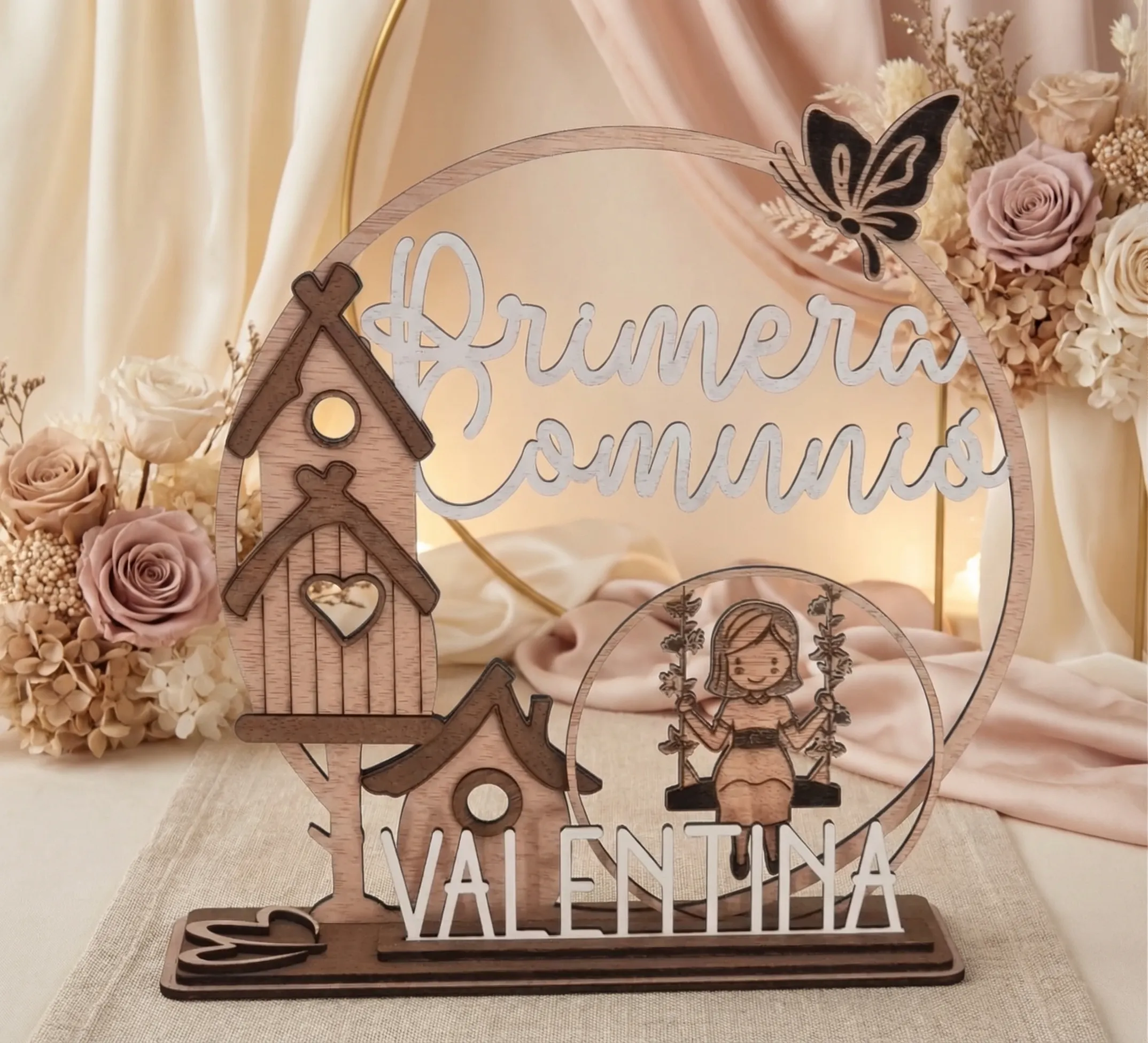 Un columpio decorativo para protagonista de comunión, diseñado con un estilo delicado y personalizado para resaltar este día tan especial.