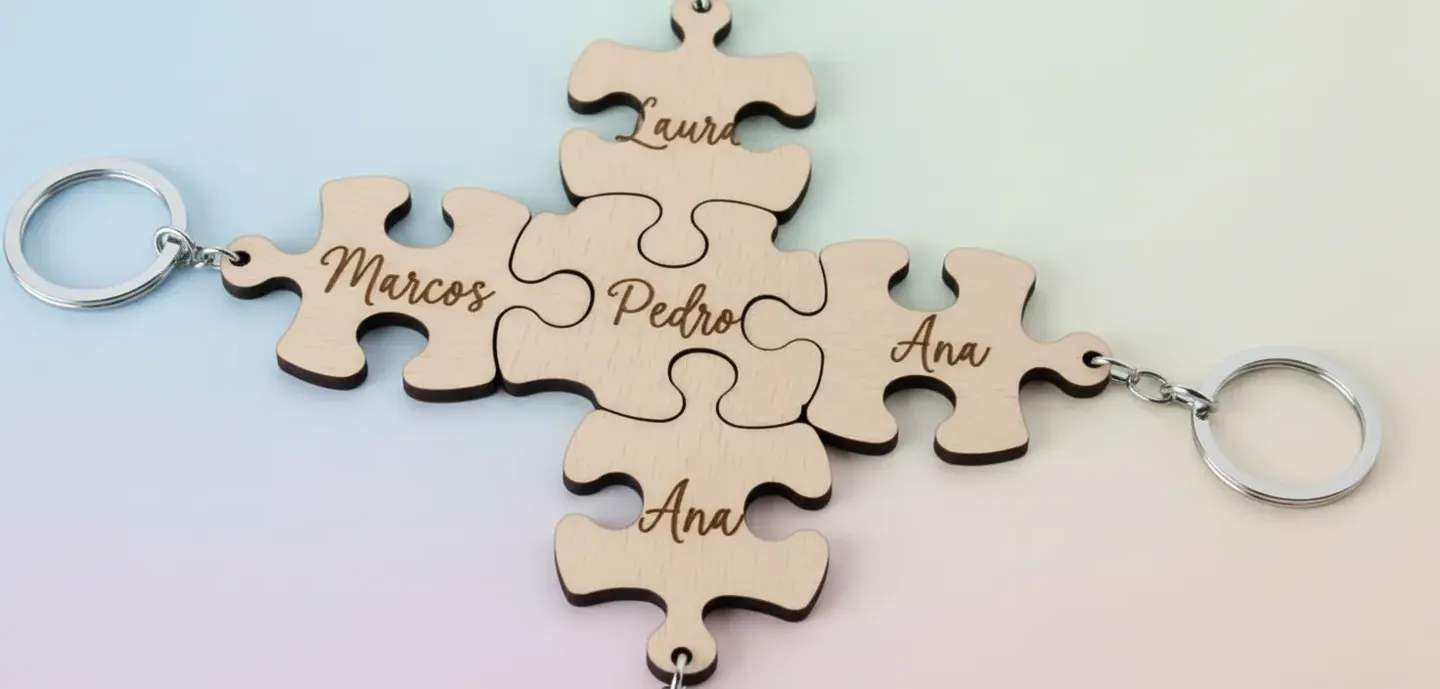 Llaveros en forma de puzzle, representando la unión y la familia. Un regalo ingenioso y sofisticado que evoca la armonía de este momento especial.