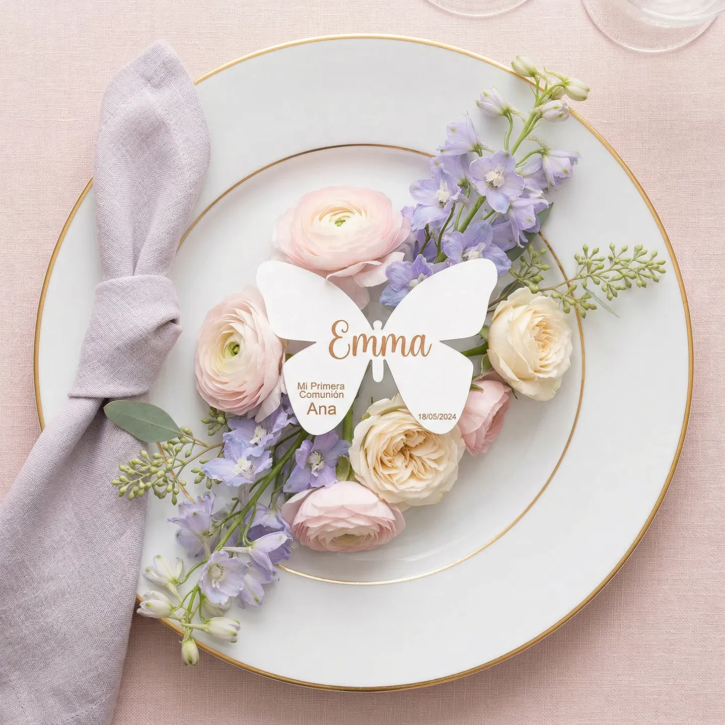 Delicados marca sitios en forma de mariposa, perfectos para añadir un toque de encanto y elegancia a la mesa de la comunión. Un detalle sutil y hermoso que embellece la celebración.